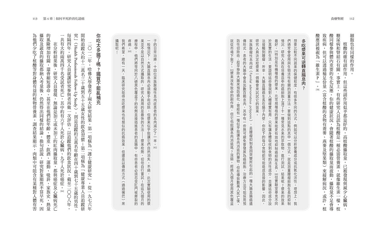 比較兩個極端例子──多菜少肉及多肉少菜的飲食習慣,罹患大腸直腸癌的風險可能差了八倍之多。因此,只在飲食中減少吃肉還是不夠的;你還需要多吃些植物。美國國家癌症研究所的預防息肉試驗發現,增加每日豆類攝取量的那些人,癌前期大腸直腸息肉復發的機率降低了多達六五%,而所多吃的豆類份量甚至不到四分之一杯。