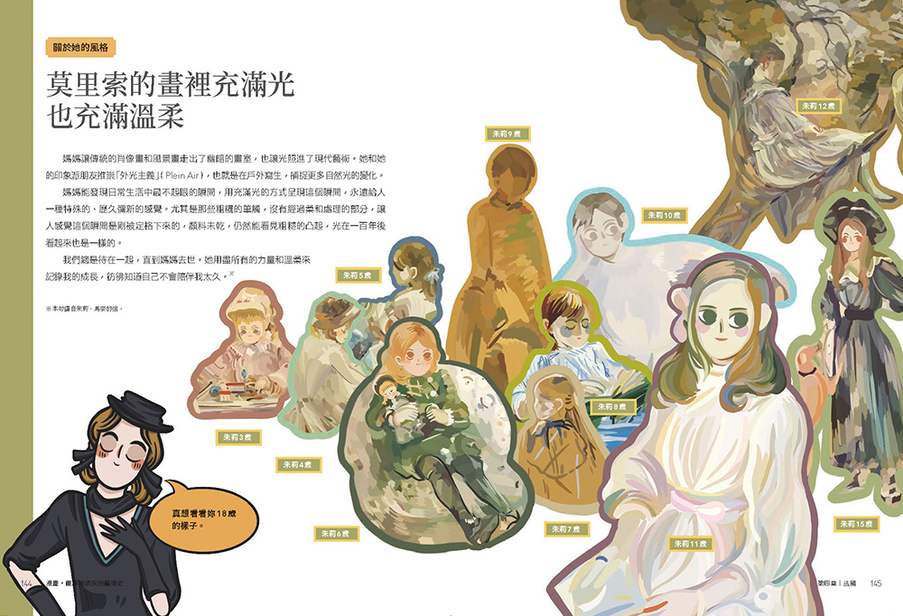 在闡述每一位女藝術家作品的動人之處和她們對藝術史的影響之外,我們還加入了「人物頁」和「印象頁」──前者介紹對女藝術家影響深遠的,或是不可或缺的親密人物,後者闡述她的作品和風格給人最主要的印象,讓你可以迅速抓住關於她的關鍵字。