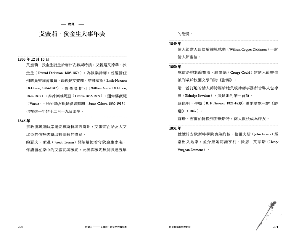 或許正因為這些信件流露出詩人最隱祕的愛與期待、脆弱與恐懼,狄金生的家人基於保護立場,直到她過世七十年後才讓它們出現在世人面前,我們也因而得以走進她的心靈世界。