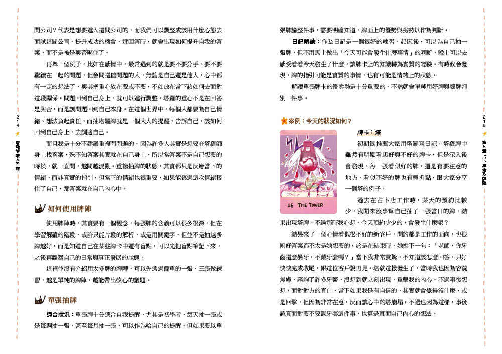 ・不僅牌面符號拆解,更帶入實戰範例,讓你對占卜更得心應手。